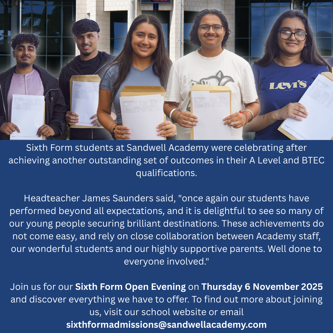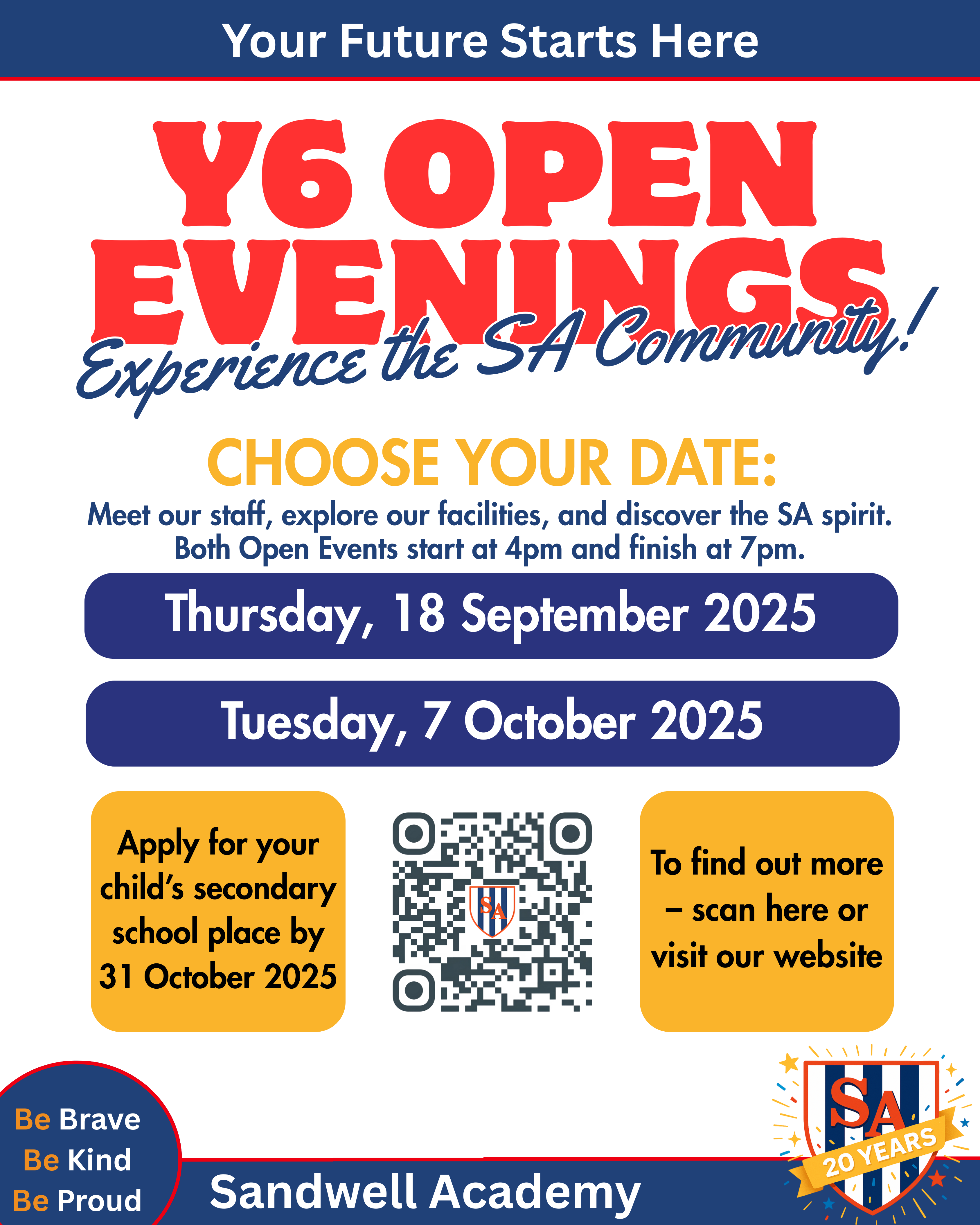 π Year 6 Open Evenings! π Meet our amazing staff, explore our facilities, and discover the SA spirit! π Dates: 18th September & 7th October π Time: 4:00pm β 7:00pm We canβt wait to welcome our future students! #SandwellAcademy #OpenEvening #Year6 #SchoolOpenDay #FutureStudents #ExploreSA #Educ...Read more